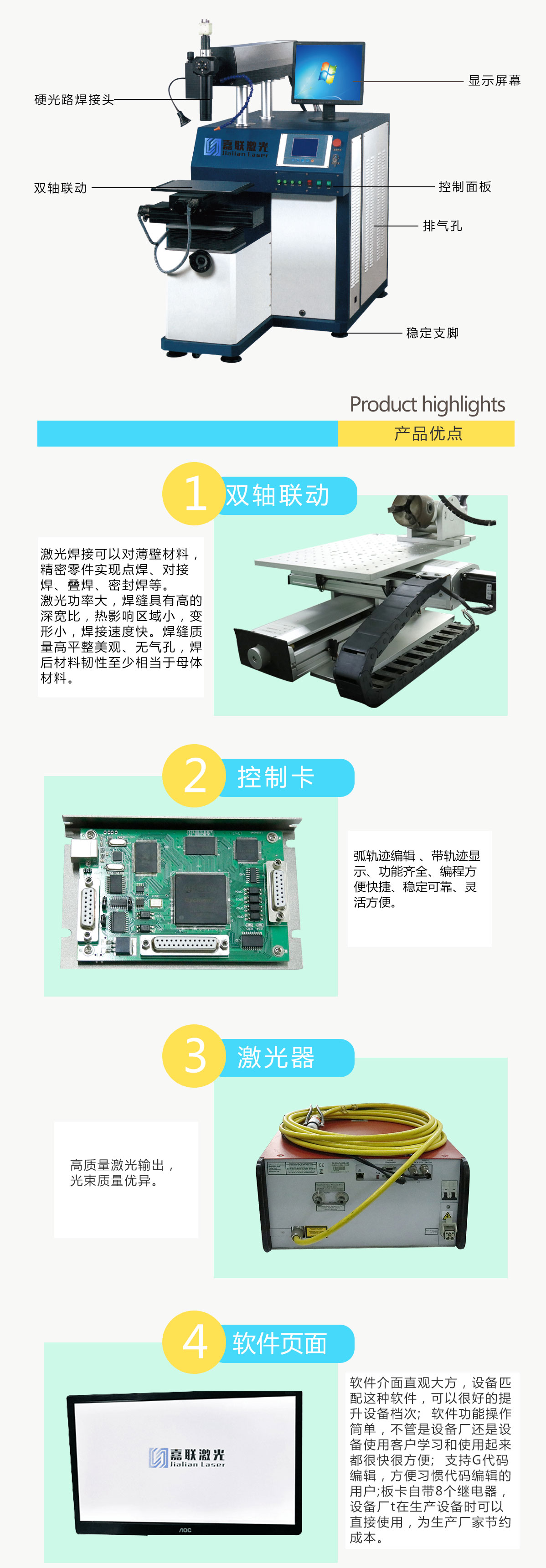 焊接機及其配套旋轉夾具、采用CNC控制系統,可焊接相貫線,漸開線,曲線,點整列,等任意軌跡。該設備為我公司針對精密焊接行業專門研發,擁有高倍放大系統、深受廣大用戶好評。新款的設備采用恒壓源電源方式,有觸摸屏和按鍵式可以選擇,該電源系統波形可調,光路系統通過優化,...